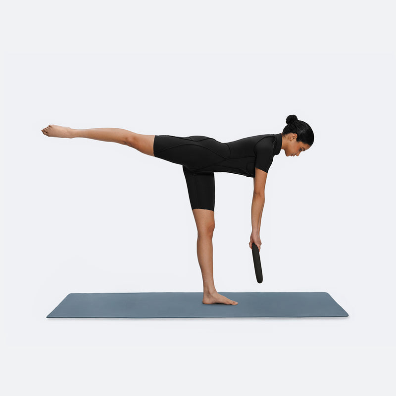 Stand on your left leg and hold your Weight Loop on hip level. Try to find a balanced position. Lower your body and simultaneously stretch out your right leg backward. As you lower your body, lower your Loop to the floor. Repeat.