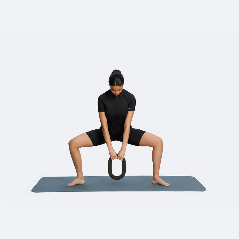 Stand with your feet shoulder-width apart, your toes turned outward. Hold your Weight Loop with both hands on hip level. As you squat, lower the Loop as low as you can while keeping your back straight. As you go up, pull the Loop up to your chin. Repeat.