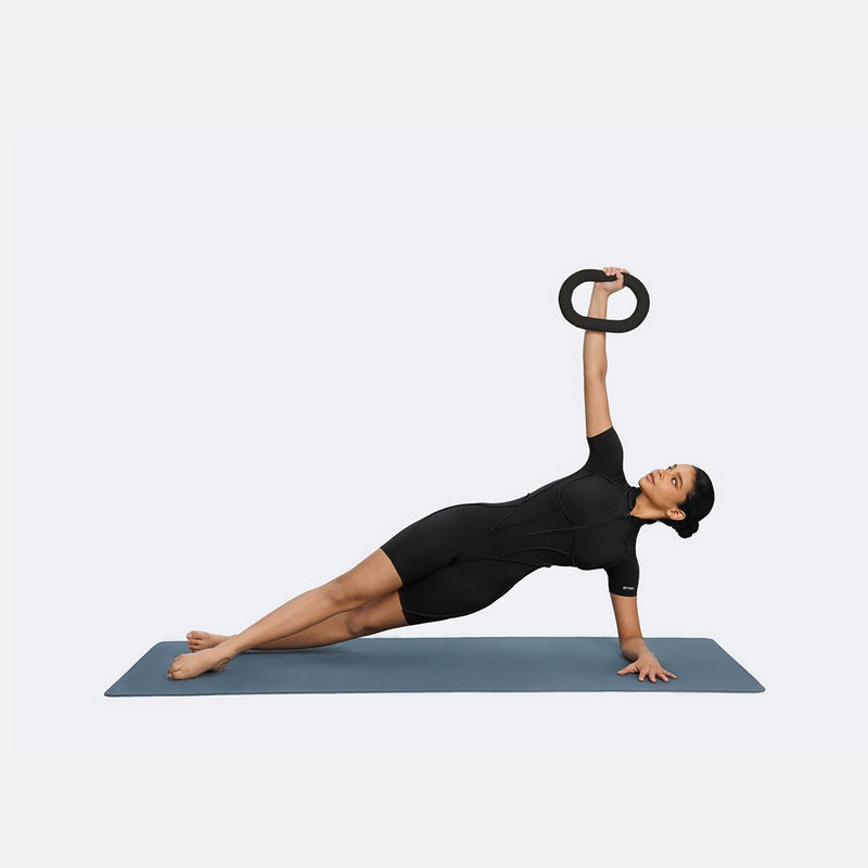 Take a side plank position on your left arm. Keep your back straight and cross your ankles for balance. Hold your Weight Loop in front of you with your right hand. Raise it up above your head, fully straightening your arm. Follow the Loop with your gaze. Lower it and repeat.