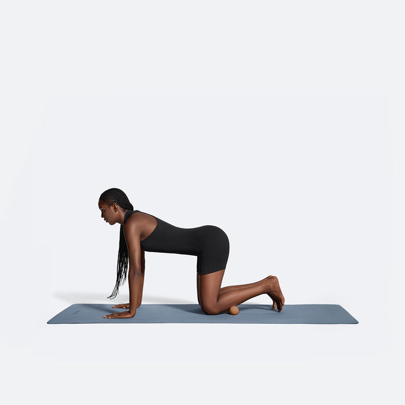 Begib dich in die Kuhstellung und lege den Ball unter dein Schienbein. Bewege dich langsam vorwärts und rückwärts, um diese Stelle zu massieren und dich von Verspannungen zu befreien.