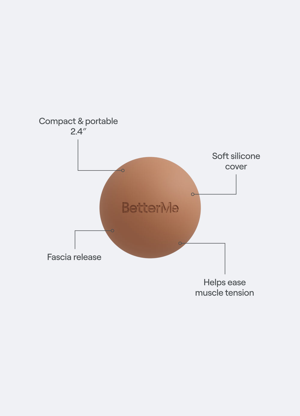 Verwende den Massage-Faszienball von BetterMe, um angestrengte Muskeln zu entspannen. Er eignet sich hervorragend für Stellen, die sonst schwer zu erreichen sind, und kann durch sanften, aber gezielten Druck Verspannungen lösen und die Muskel-Flexibilität erhöhen. Die kompakte Größe macht diesen Massageball zu einer perfekten Ergänzung für die Erholung nach dem Training zu Hause oder im Fitnessstudio.