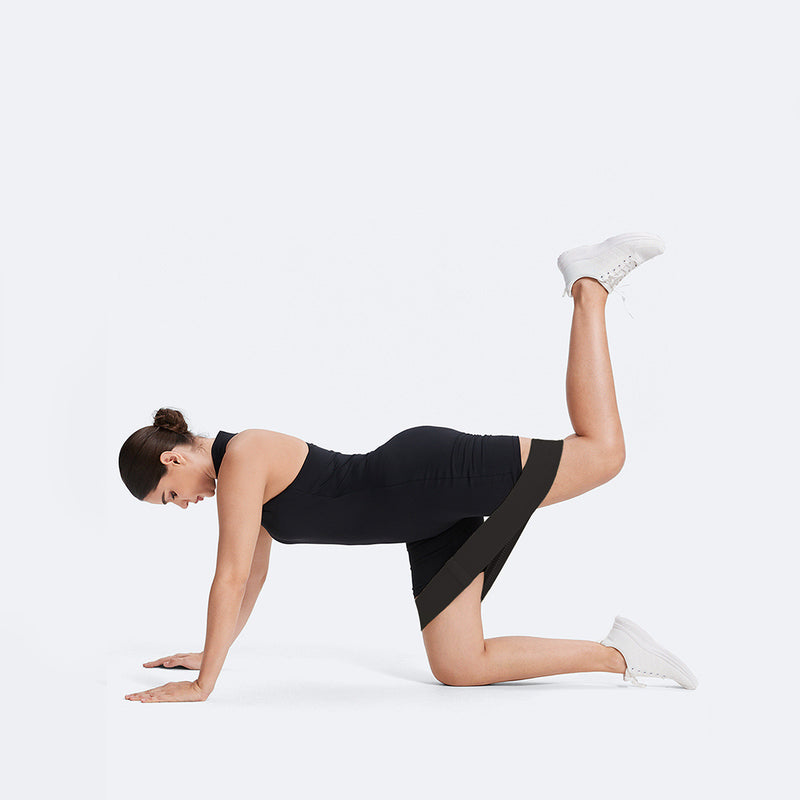 Lege das Band um deine Oberschenkel, gehe in den Vierfüßlerstand mit flachem Rücken. Trete mit dem rechten Bein nach hinten, Knie gebeugt, dann zurück. Wechsle die Beine. Bleibe dran für einen stärkeren Po!