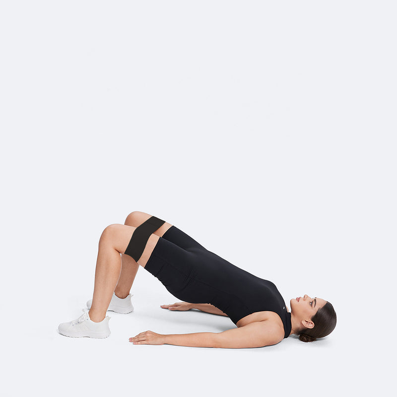Lege das Band oberhalb deiner Knie an und lege dich hin, Fersen unten, Knie gebeugt. Hebe das Becken in eine Brücke und öffne die Oberschenkel weit. Senke ab und schließe sie wieder. Aktiviere Bauch, Gesäß und hintere Oberschenkel bei jeder Wiederholung!
