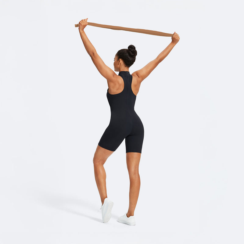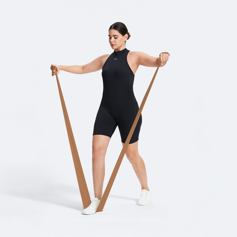 Párate sobre la banda, con los pies separados. Con la espalda recta, levanta los brazos hasta que los codos se alineen con los hombros y luego bájalos. ¡Fortalece los hombros con cada remo!