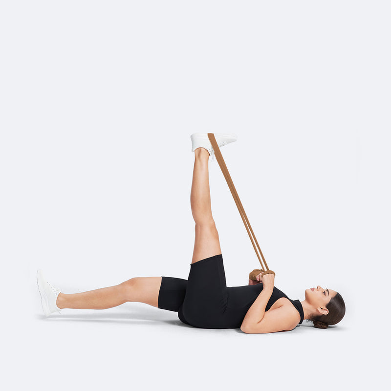 Recuéstese, la banda en la parte media del pie de la pierna derecha, la pierna izquierda plana. Sujete los extremos de la banda, levante la pierna derecha recta, luego flexione y estire la rodilla. Repita y cambie de pierna.