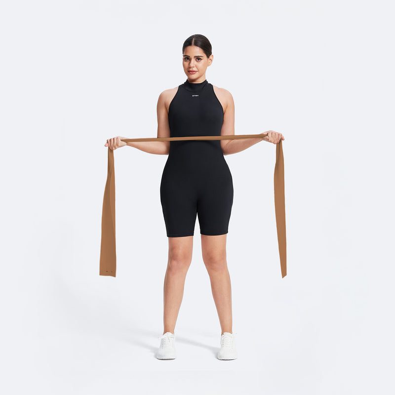 De pie con las piernas y las manos separadas a la anchura de los hombros, manteniendo la banda tensa. Tire hacia afuera, manteniendo los antebrazos nivelados, y vuelva al centro. Repita y sienta cómo se trabajan los hombros