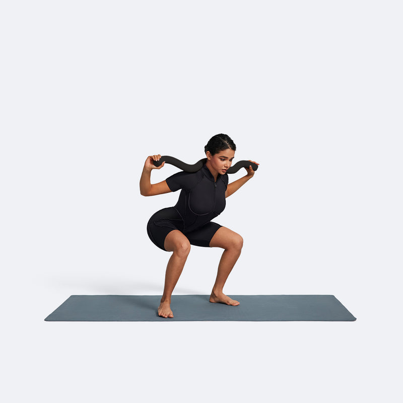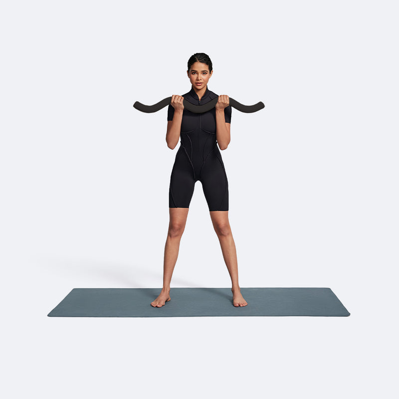 Adopta una postura amplia y coloca tu Body Bar sobre los hombros por detrás de la cabeza. Sujétala con ambas manos por los extremos. Realiza sentadillas.