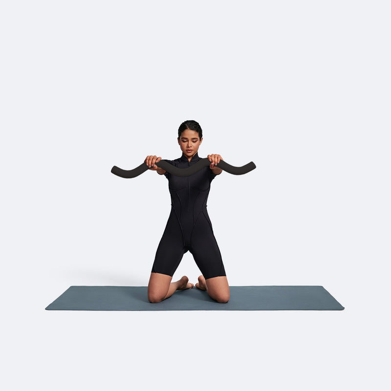 Arrodíllate sobre una colchoneta. Sujeta tu Body Bar con ambas manos , los brazos bajados y relajados. Levanta la barra hasta la altura de los hombros y mantén los brazos estirados. Bájala de nuevo y repite.