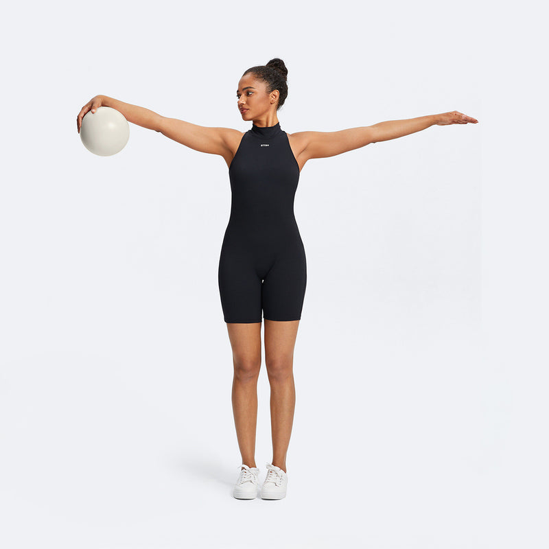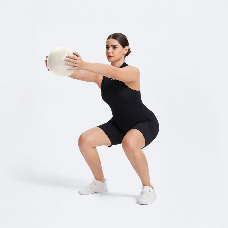 Ponte de pie con las piernas separadas, aprieta la pelota de Pilates con los codos doblados. Haz una sentadilla profunda, luego sube, manteniendo la presión. Repite para trabajar sentadillas y tren superior a la vez.