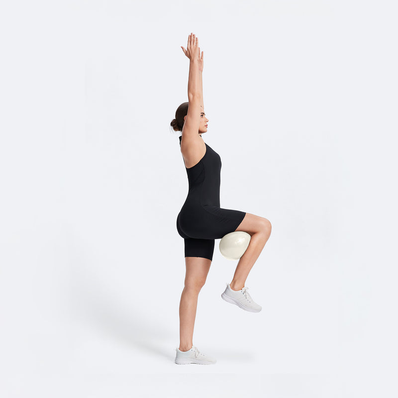 Ponte de pie, brazos arriba, coloca la pelota entre una rodilla y el muslo opuesto. Levanta la pierna, aprieta la pelota, baja con control. Fortalece y equilibra con cada elevación de pierna.