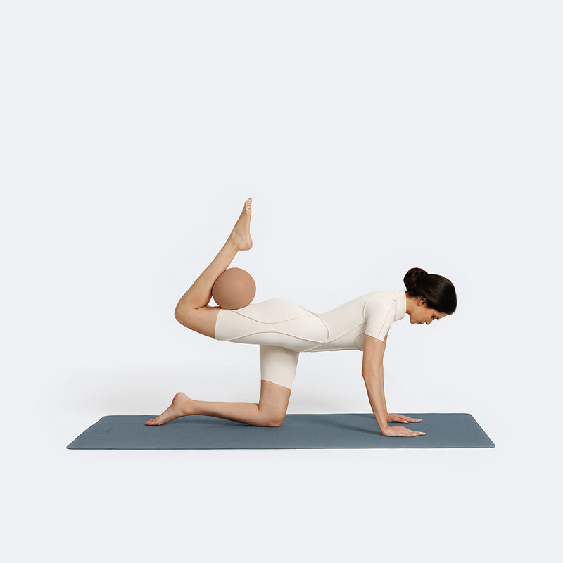 Comienza en posición de cuatro apoyos. Coloca la pelota debajo de la rodilla izquierda. Manteniendo el ángulo de 90 grados en la rodilla, eleva lentamente la pierna izquierda hacia el techo. Baja y repite.