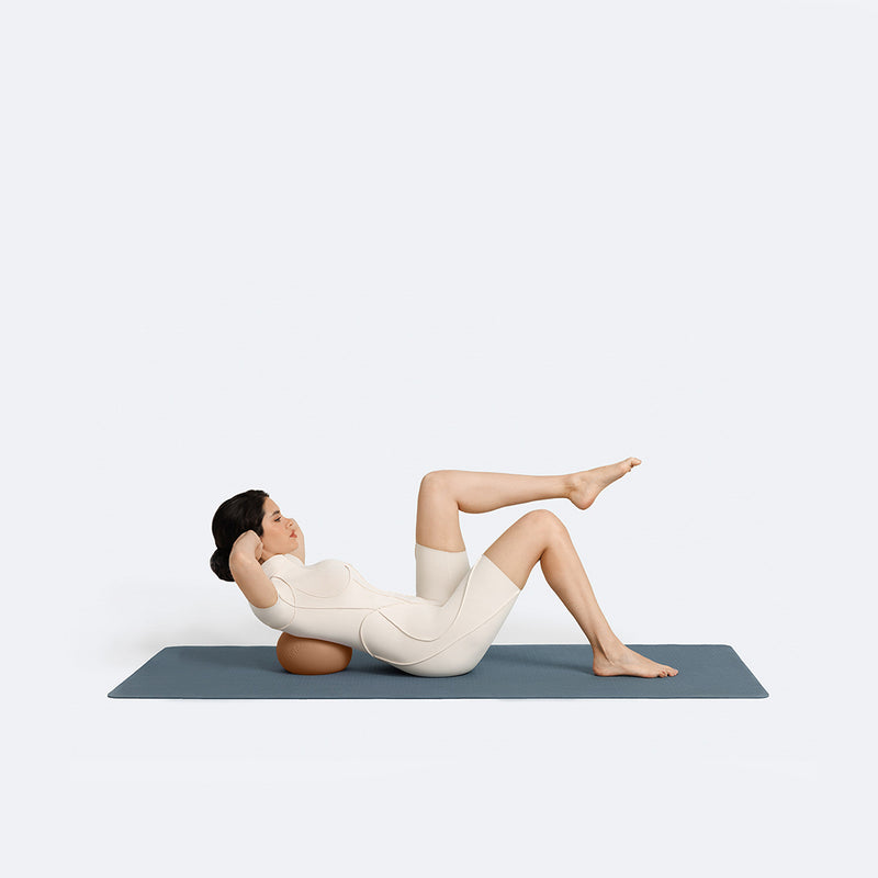 Acuéstate de espaldas con las rodillas dobladas y los pies apoyados en el suelo. Coloca la pelota debajo de los omóplatos y mantén las manos detrás de la cabeza. Enróllate hacia adelante, levantando la cabeza, el cuello y los omóplatos del suelo mientras subes la rodilla derecha. Mantén la posición brevemente en la parte superior y baja lentamente. Repite con la otra rodilla.