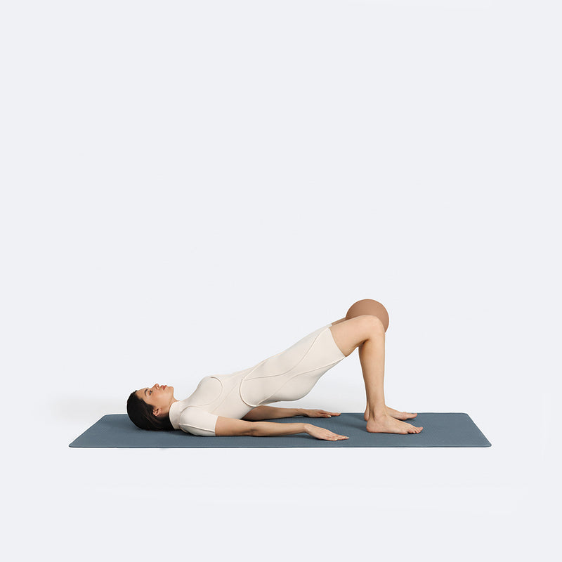 Acuéstate de espaldas con las rodillas dobladas y los pies apoyados en el suelo. Sostén la pelota entre las rodillas. Eleva las caderas. En esta posición, aprieta la pelota con las rodillas y suelta. Repite sin bajar las caderas.