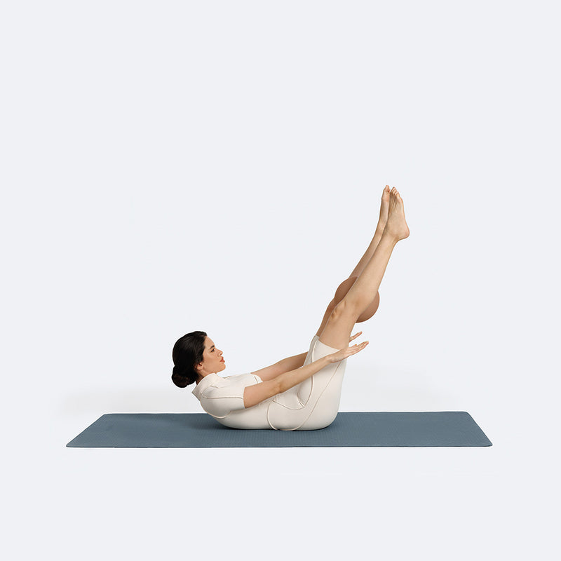 Acuéstate de espaldas con las rodillas dobladas y los pies apoyados en el suelo. Coloca la pelota entre las rodillas y extiende las piernas en un ángulo de 45 grados. Levanta los brazos y la cabeza. Mantén las piernas quietas y mueve los brazos arriba y abajo.