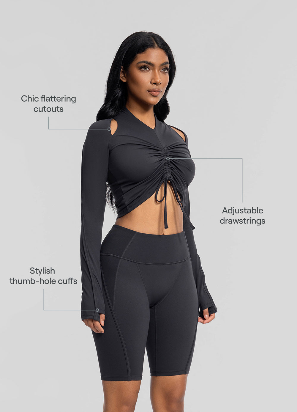 Déjate llevar, o toma el control, con el top adaptable con cordón. Este top es para las que prefieren las opciones: ciñe la parte delantera con pliegues para un look elegante y entallado o aflójalo cuando quieras dejarte llevar. El tejido suave y elástico se mueve como el agua, manteniéndote fresca y cómoda vayas a la velocidad que vayas.
