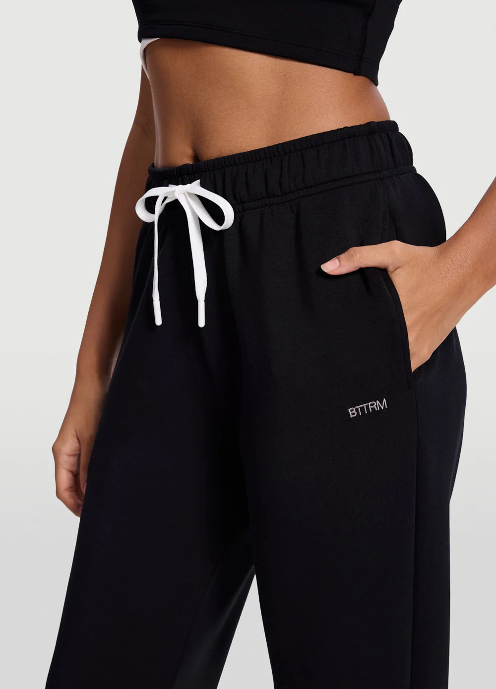 - Sweatpants: Straight leg fit, elastic cuffs