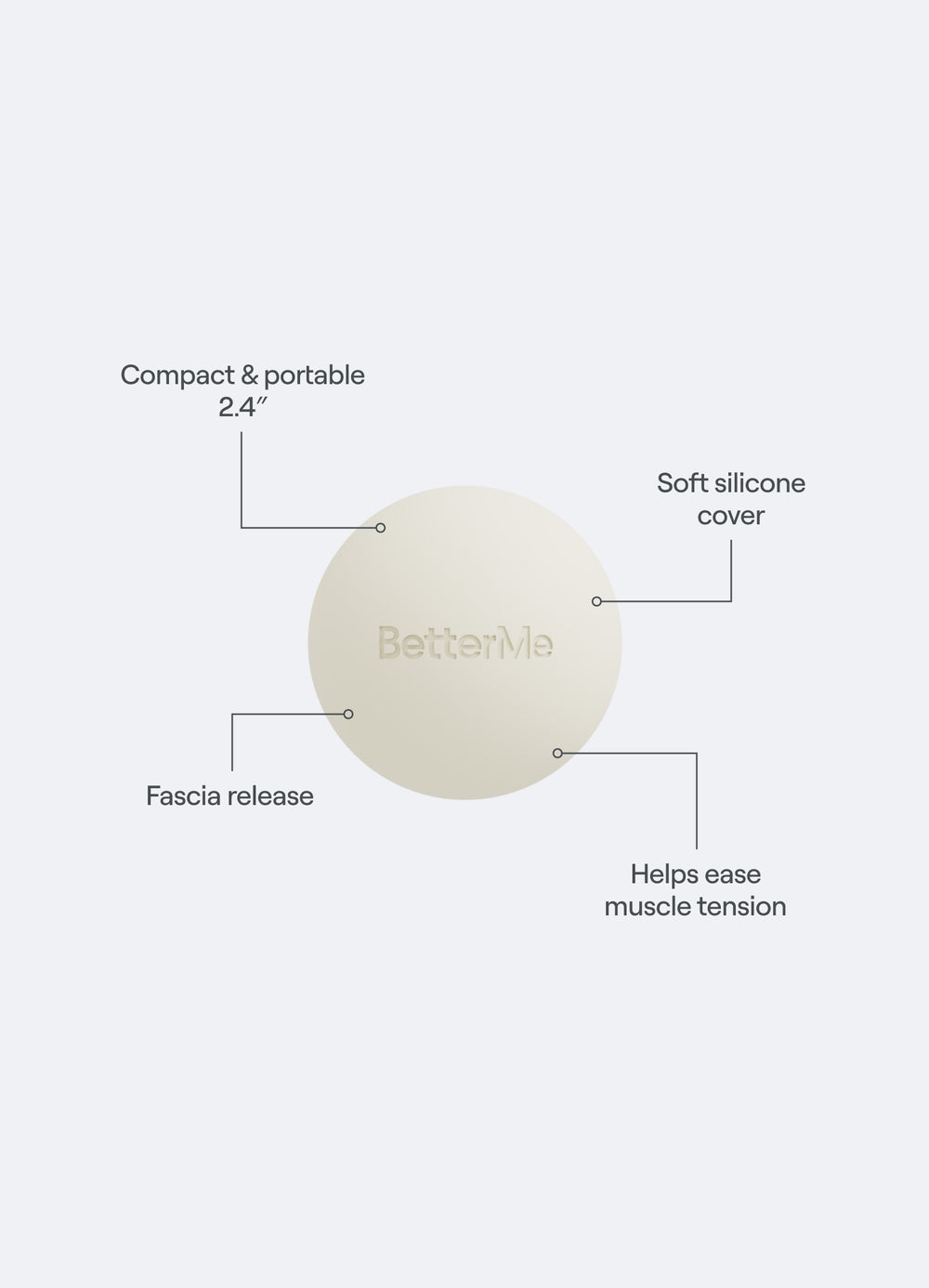 Soulagez vos muscles endoloris grâce à la balle pour massage de récupération BetterMe. Adapté aux zones difficiles d’accès, cet accessoire nomade vient exercer une pression douce pour atténuer les tensions et retrouver de la souplesse. Son format compact vous permet de l’emporter partout, pour une utilisation à la maison comme en déplacement.