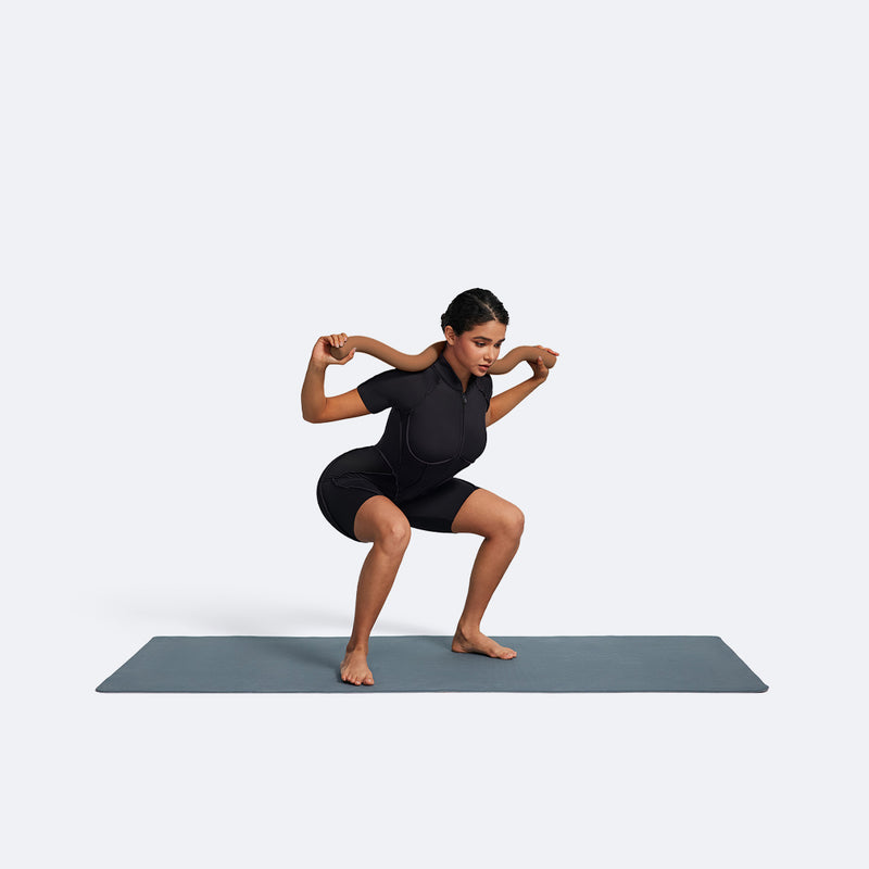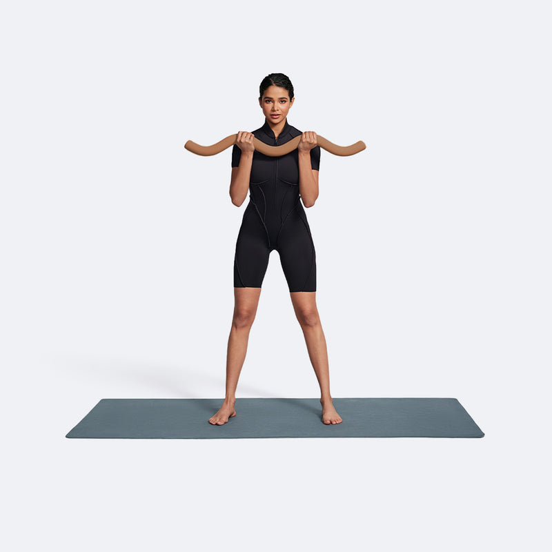 Take a wide stance and put your Body Bar on your shoulders behind your head. Hold it with both hands at its ends. Perform squats.