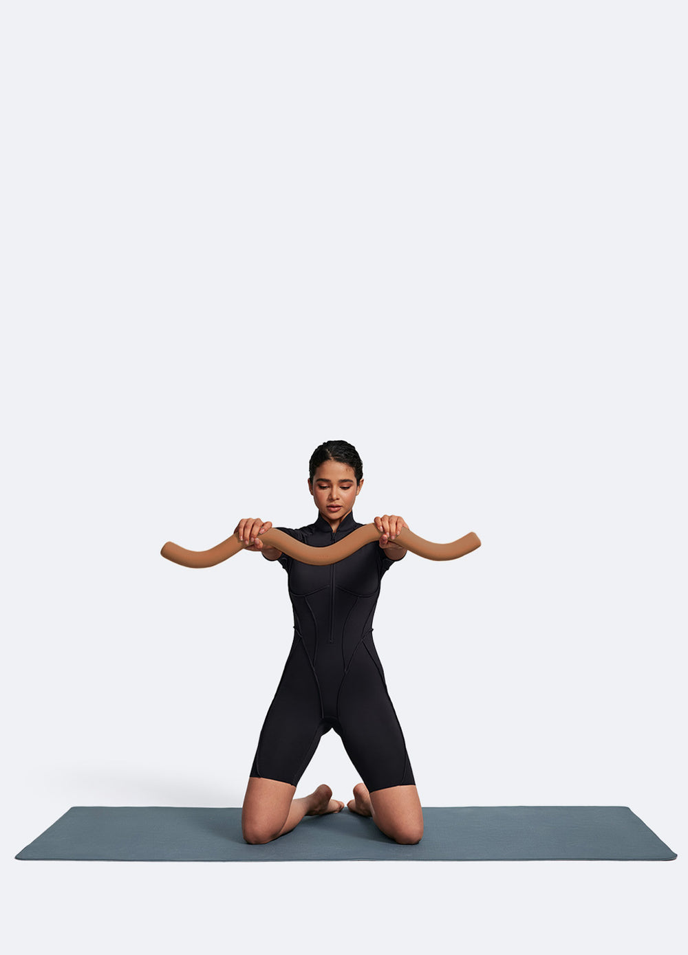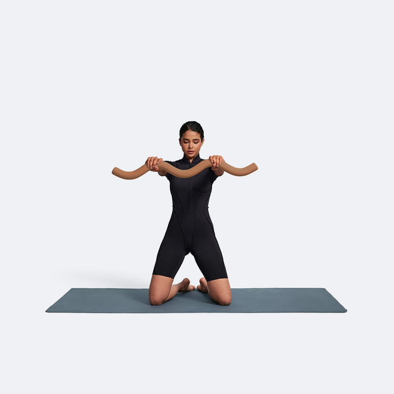 Kneel on a mat. Hold your Body Bar with both hands, arms lowered and relaxed. Raise the bar up to your shoulder level and keep your arms straight. Lower it back down and repeat.