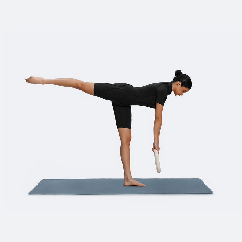 Stand on your left leg and hold your Weight Loop on hip level. Try to find a balanced position. Lower your body and simultaneously stretch out your right leg backward. As you lower your body, lower your Loop to the floor. Repeat.