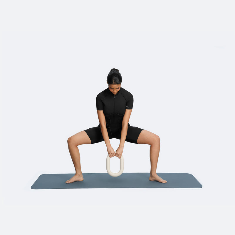 Stand with your feet shoulder-width apart, your toes turned outward. Hold your Weight Loop with both hands on hip level. As you squat, lower the Loop as low as you can while keeping your back straight. As you go up, pull the Loop up to your chin. Repeat.