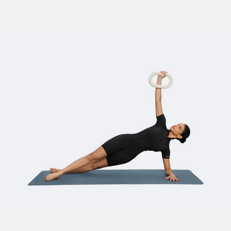 Take a side plank position on your left arm. Keep your back straight and cross your ankles for balance. Hold your Weight Loop in front of you with your right hand. Raise it up above your head, fully straightening your arm. Follow the Loop with your gaze. Lower it and repeat.