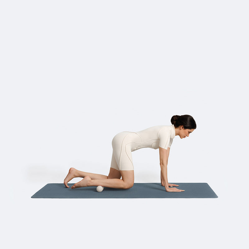 Mettiti in posizione di crunch e posiziona la Pallina a Forma di Arachide sotto la schiena. Posiziona le mani dietro la testa e contrai il core. Premi delicatamente la schiena contro la pallina e mantieni la posizione per qualche respiro. Spostati leggermente da un lato all'altro per massaggiare le zone contratte.