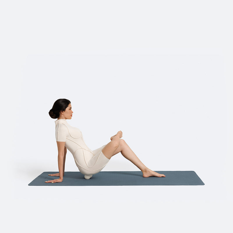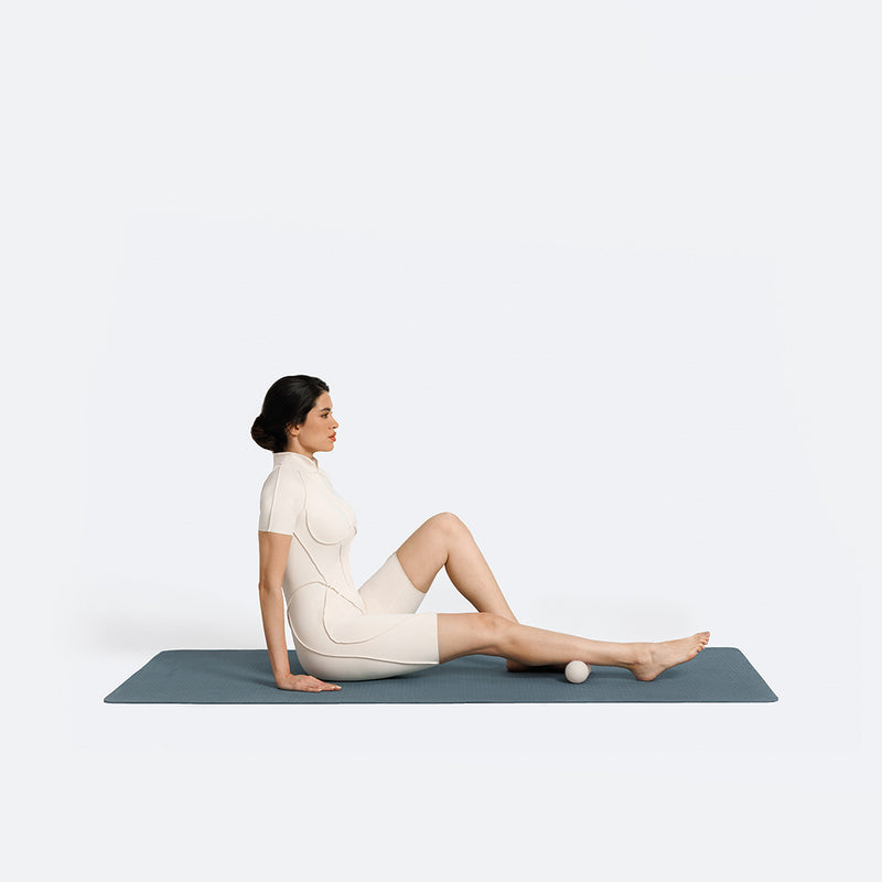 Siediti sul pavimento e posiziona la Pallina a Forma sotto il gluteo. Incrocia una caviglia sopra il ginocchio opposto. Inclina l'altro ginocchio. Sostieniti con le mani dietro di te. Scorri lentamente avanti e indietro per massaggiare i muscoli del gluteo. Soffermati nei punti critici e respira profondamente.