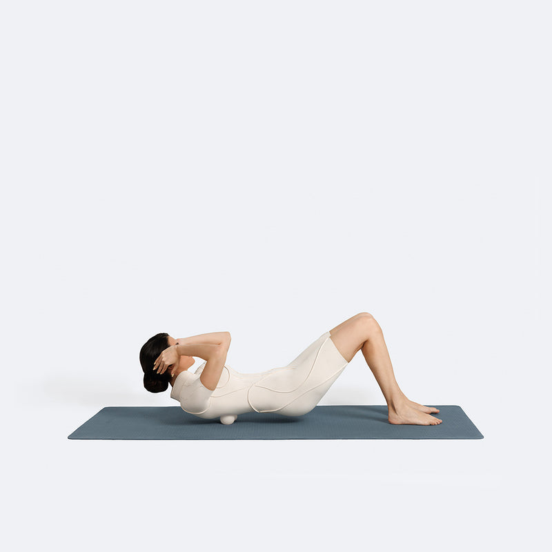 Mettiti in posizione di crunch e posiziona la Pallina a Forma di Arachide sotto la schiena. Posiziona le mani dietro la testa e contrai il core. Premi delicatamente la schiena contro la pallina e mantieni la posizione per qualche respiro. Spostati leggermente da un lato all'altro per massaggiare le zone contratte.