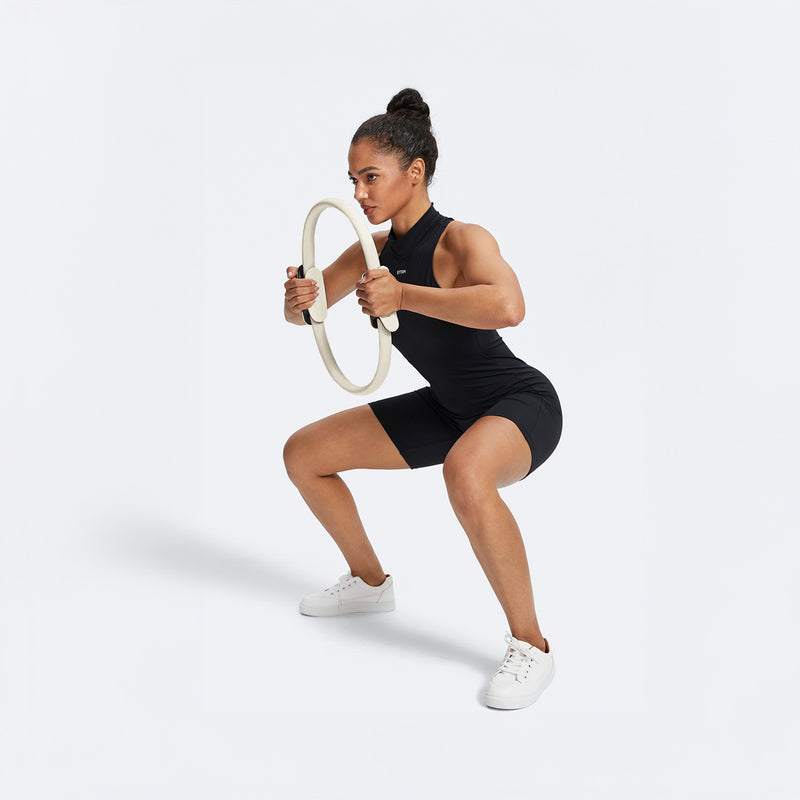 Stai in piedi con i piedi divaricati, il Pilates Ring tra le mani. Accovacciati, estendi le braccia e porta l'anello in avanti. Sollevati, piega i gomiti, unisci le braccia. Ripeti, combinando gli squat con la forza delle braccia.