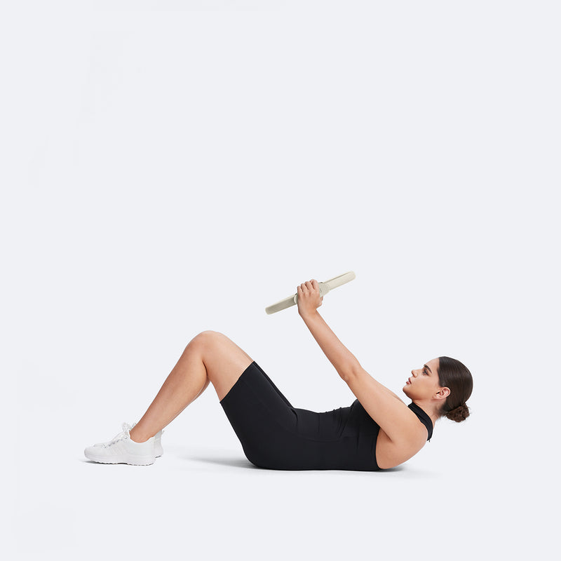 Sdraiati, ginocchia piegate, anello Pilates tra le mani. Mentre esegui i crunch, stringi l'anello, concentrandoti sul coinvolgimento del core. Senti il bruciore in ogni combinazione di crunch e contrazione.