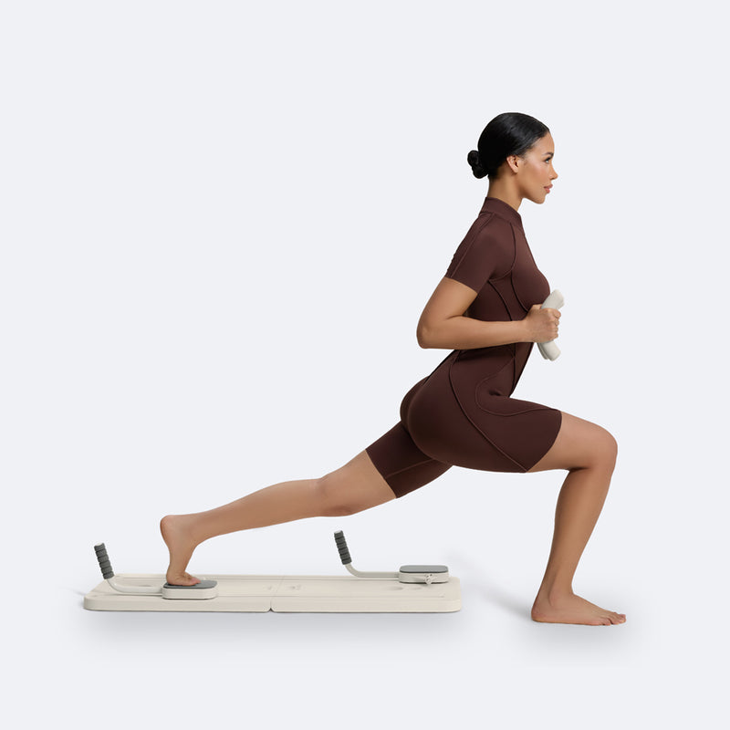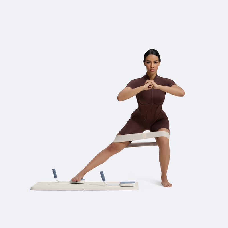 Posiziona un piede sul Mini Pilates Reformer in modo che possa scorrere liberamente, e tieni l'altro piede ben saldo a terra. Posiziona la fascia elastica appena sopra le ginocchia per una maggiore resistenza. Fai scivolare il piede del reformer lateralmente mentre pieghi leggermente la gamba d'appoggio, abbassandoti in un affondo laterale controllato mantenendo il busto eretto e il core contratto. Torna lentamente alla posizione di partenza con controllo. Questo movimento rafforza i glutei, l'interno e l'esterno coscia, migliora la stabilità dell'anca, la mobilità laterale e stimola l'equilibrio.