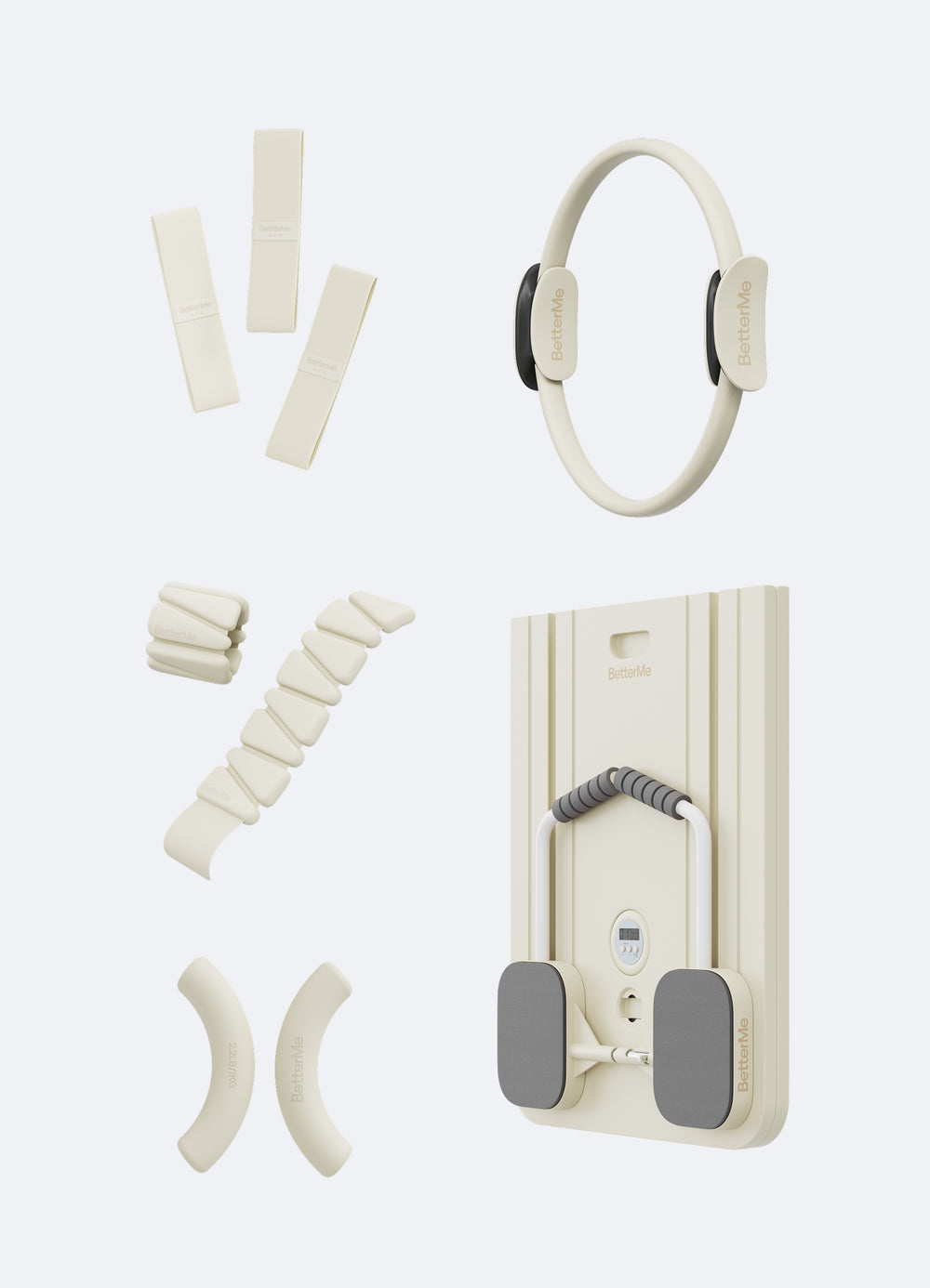 Mini Pilates Reformer: Il cuore del kit. Supporta il rafforzamento di tutto il corpo, migliorando la postura e offrendo un allenamento controllato e a basso impatto.