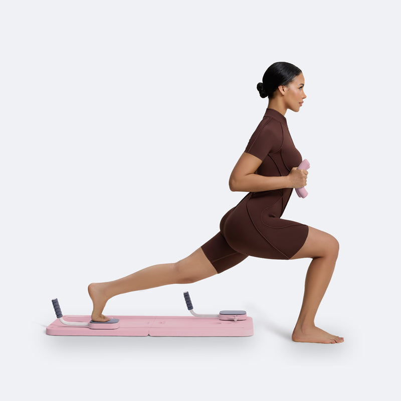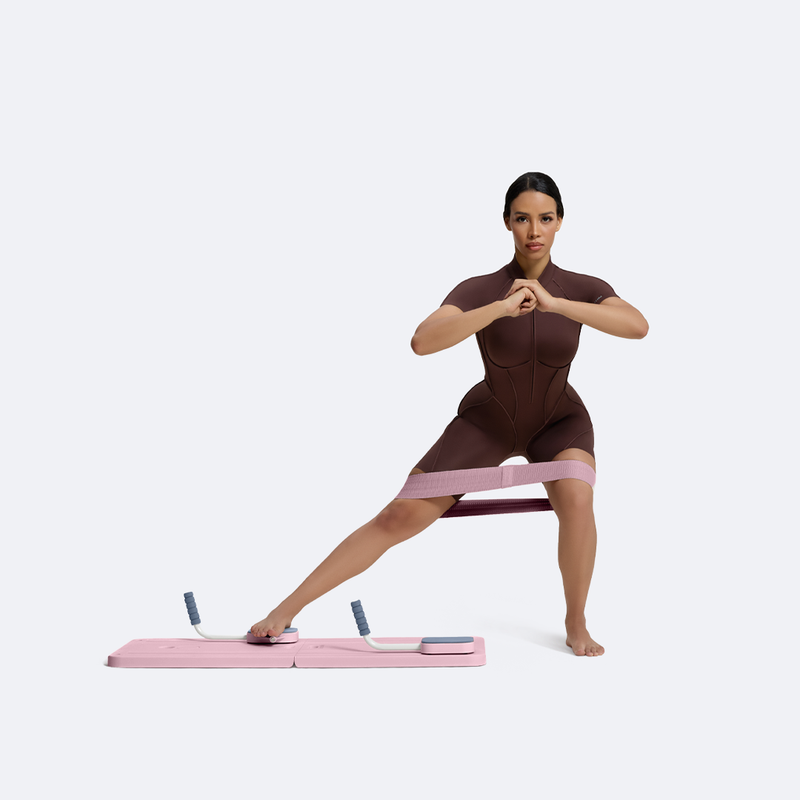 Posiziona un piede sul Mini Pilates Reformer in modo che possa scorrere liberamente, e tieni l'altro piede ben saldo a terra. Posiziona la fascia elastica appena sopra le ginocchia per una maggiore resistenza. Fai scivolare il piede del reformer lateralmente mentre pieghi leggermente la gamba d'appoggio, abbassandoti in un affondo laterale controllato mantenendo il busto eretto e il core contratto. Torna lentamente alla posizione di partenza con controllo. Questo movimento rafforza i glutei, l'interno e l'esterno coscia, migliora la stabilità dell'anca, la mobilità laterale e stimola l'equilibrio.