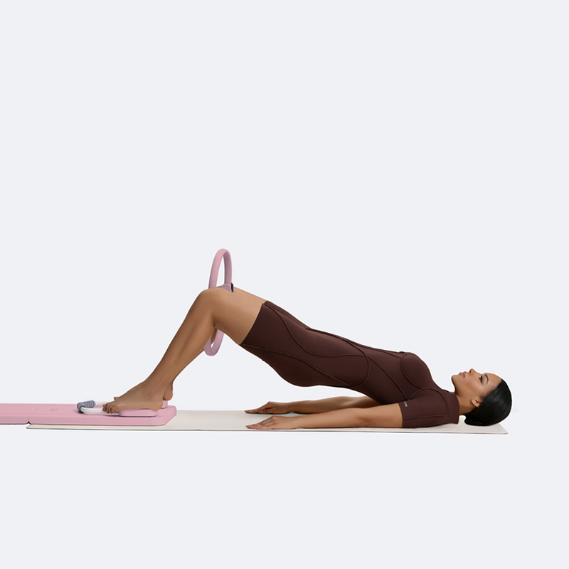 Sdraiati sulla schiena con i piedi appoggiati sul Mini Pilates Reformer e la palla posizionata tra le ginocchia o l'interno coscia. Spingi sui talloni per sollevare i fianchi, formando una linea retta dalle spalle alle ginocchia. In alto, stringi delicatamente la palla e mantieni la posizione per un momento prima di rilasciare leggermente la tensione. Abbassa i fianchi con controllo e ripeti. Questo movimento rafforza glutei e femorali, attiva l'interno coscia e favorisce un migliore allineamento pelvico e stabilità del core.