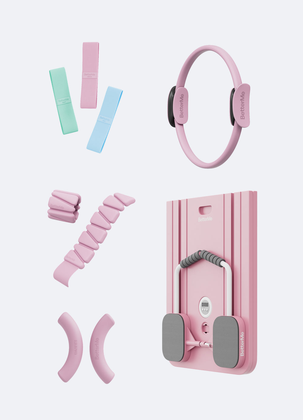 Mini Pilates Reformer: Il cuore del kit. Supporta il rafforzamento di tutto il corpo, migliorando la postura e offrendo un allenamento controllato e a basso impatto.