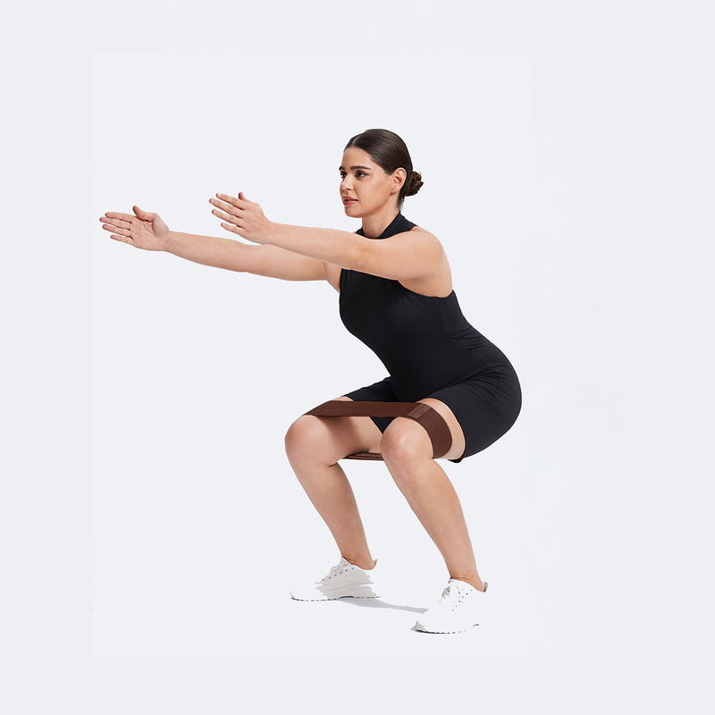 Fissa la fascia sopra le ginocchia. Accovacciati con le braccia distese. Appoggia sul piede sinistro, muovi la destra lateralmente e poi indietro. Ripeti!