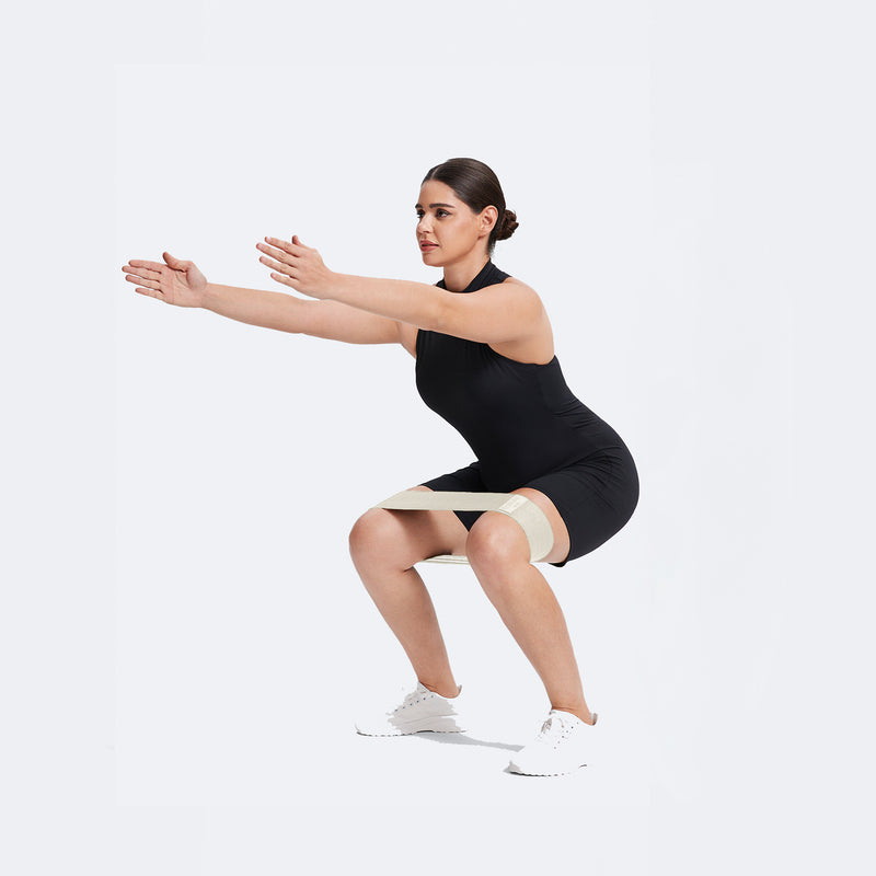 Fissa la fascia sopra le ginocchia. Accovacciati con le braccia distese. Appoggia sul piede sinistro, muovi la destra lateralmente e poi indietro. Ripeti!