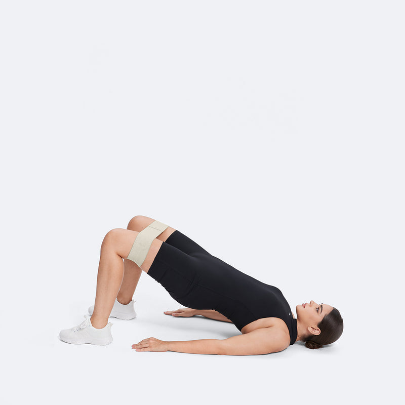 Fissa la fascia sopra le ginocchia, sdraiati, talloni a terra, ginocchia piegate. Solleva in ponte, apri le cosce, poi abbassa e richiudi. Coinvolgi core, glutei e femorali!
