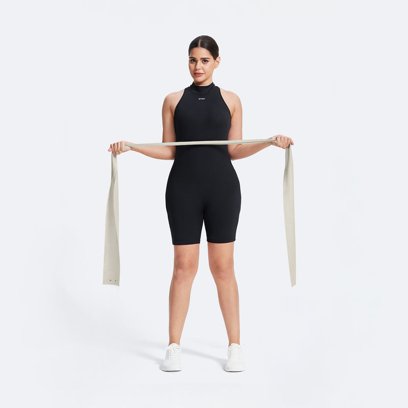 Stai in piedi con gambe e mani alla larghezza delle spalle, tenendo la fascia tesa. Tira verso l'esterno, mantenendo gli avambracci allineati, e torna al centro. Ripeti e senti le spalle lavorare