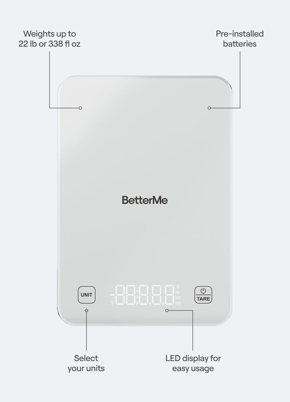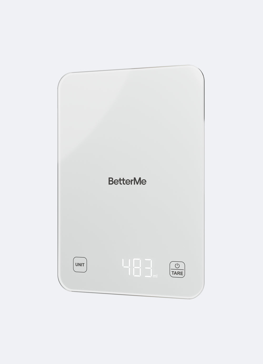 Add ease and precision to your wholesome eating routine with BetterMe Kitchen Scale. Whether you are cooking for now or meal prepping, it will come in handy with the weight removal feature for easy container taring. Perfect for both dry and liquid ingredients, and all ready to become your favorite kitchen companion.