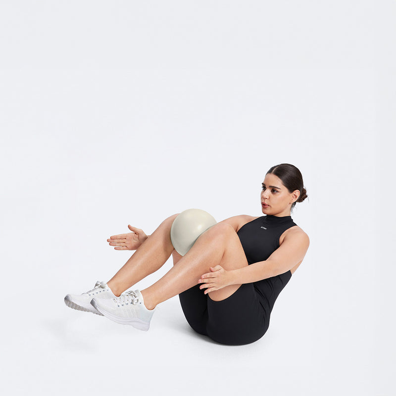 Sit, ball between knees. Lean back, lift into a V-shape, squeezing the ball. Hold, then lower. Engage your core for balance and strength in each V-sit.