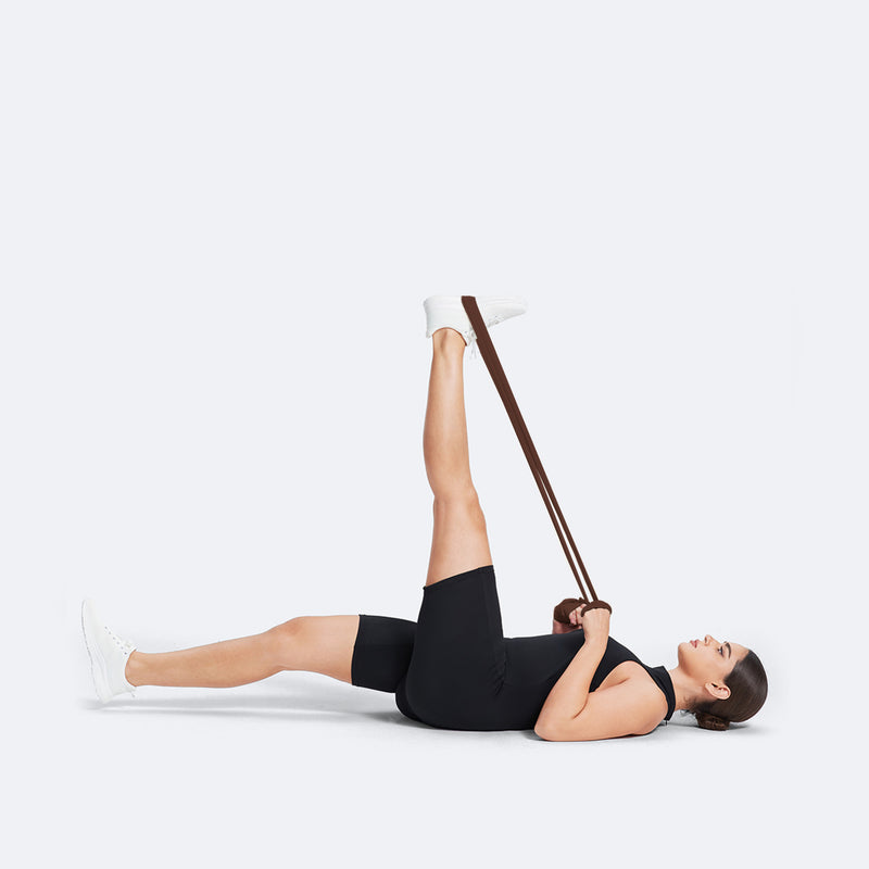 Lie back, band mid-foot on your right leg, left leg flat. Hold the band ends, lift your straight right leg up, then bend and straighten at the knee. Repeat and switch legs.
