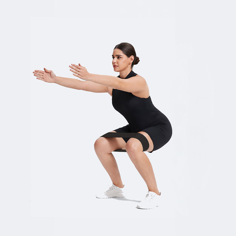 Slip the band above your knees and squat deeply, keeping your knees behind your toes and your back flat. Rise and repeat. Feel the strength in every squat!