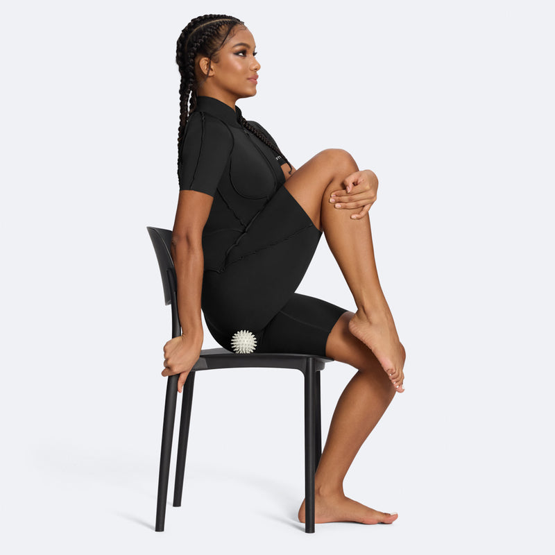 Sit down and place the smaller spiky ball under your glute. Press into trigger points while breathing steadily or slowly roll forward and back to release tension in the muscles. This exercise helps relax tight glutes and improve flexibility.