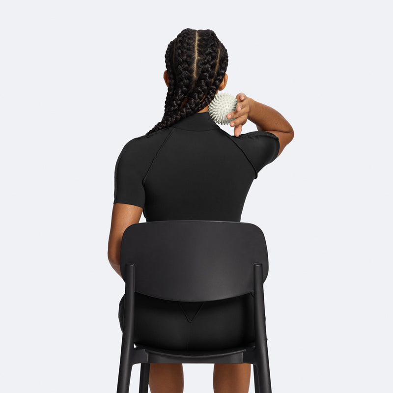 Choose any convenient spiky ball and, using your hand, roll it along the side of your neck in slow, controlled movements, avoiding excessive pressure. This exercise improves neck mobility and relieves stiffness.