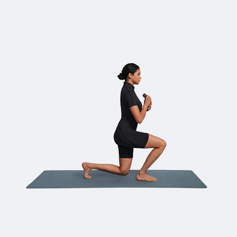 Take a dumbbells and hold them in front of your chest. Take a step back with your left leg. Bend your right knee and touch the floor with your left knee. Return to the starting position and repeat.