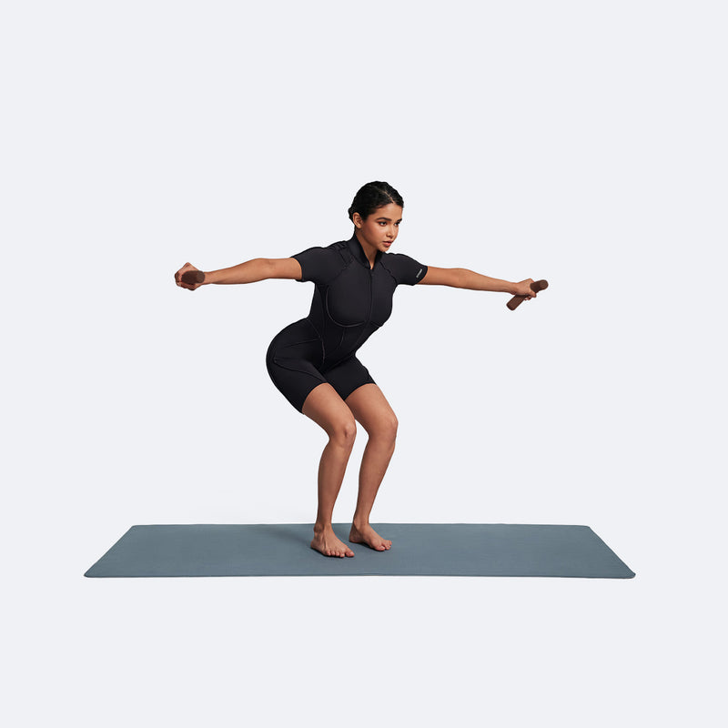 Stand tall with a dumbbells in each hand. Bend your elbows, palms facing up. Make a squat and extend your arms to the sides. Return to the starting position and repeat.
