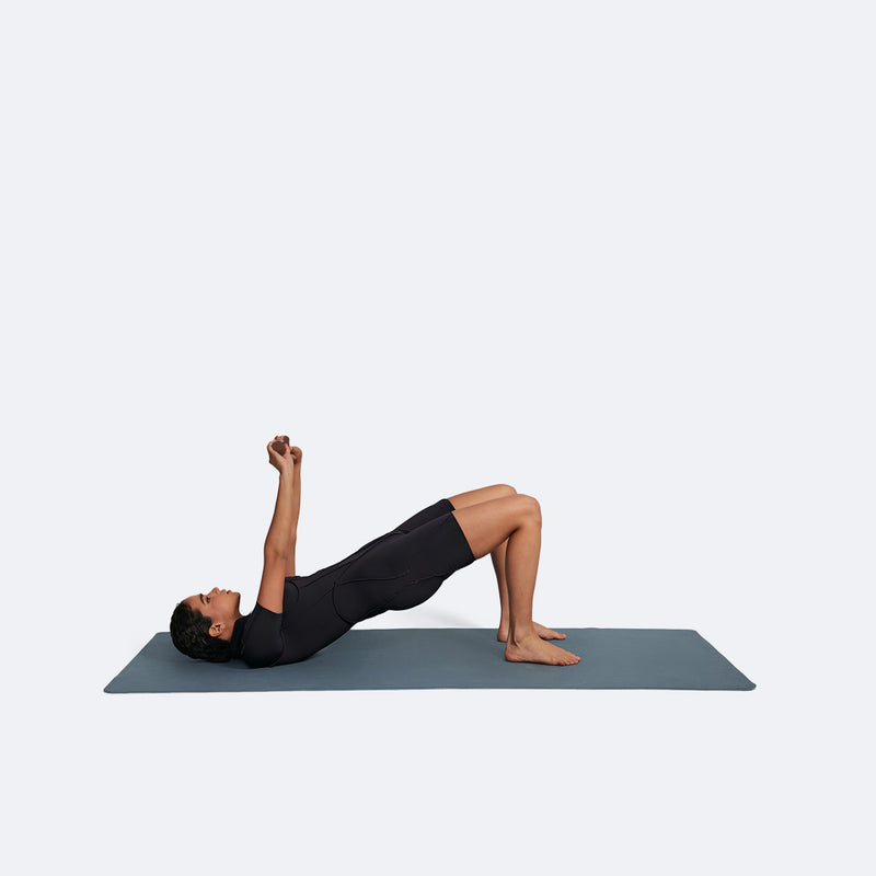 Begin on your back with a dumbbell in each hand and knees bent with heels on the floor close to your hips. Push your hips up into a glute bridge while simultaneously pressing the dumbbells up.