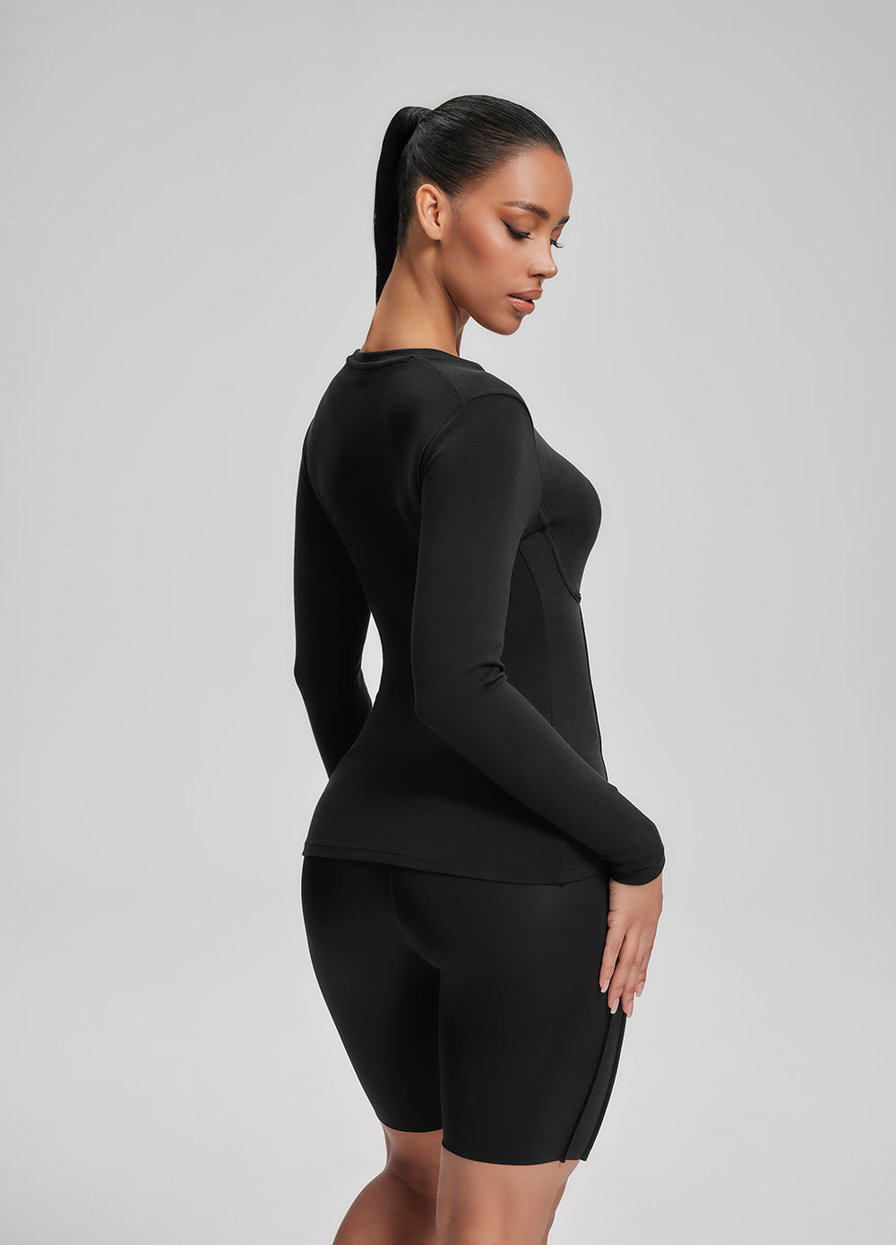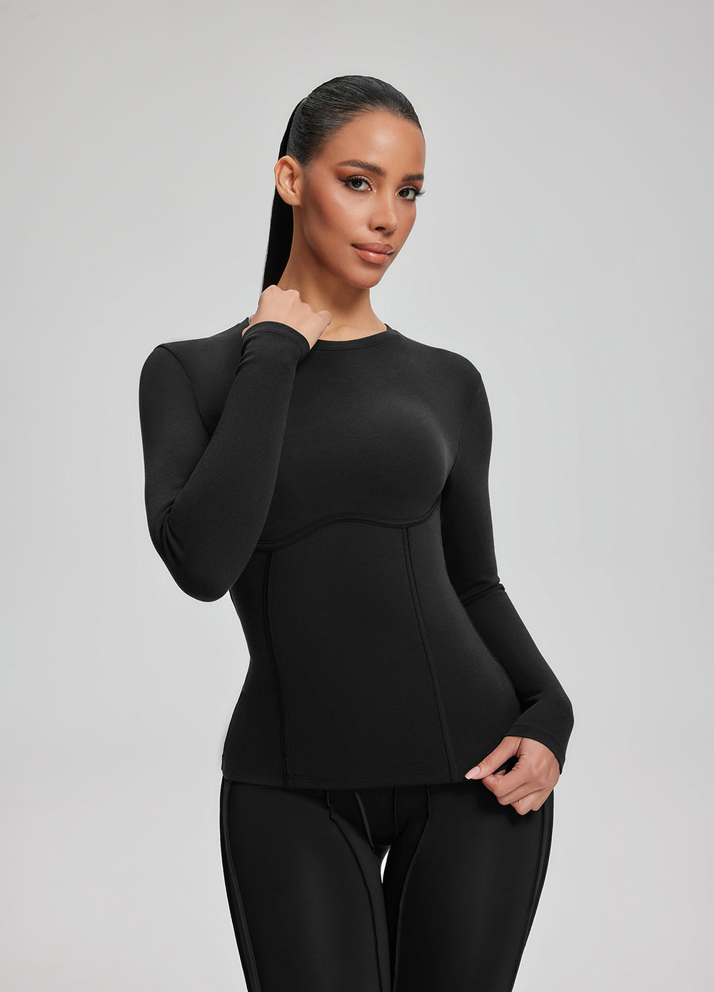 Need a bit more coverage, but tired of boring tops? We’ve got just the thing. The contour seam details on this long sleeve top create a corset-like look, emphasizing your waist. It will quickly become your favorite for stunning everyday looks.